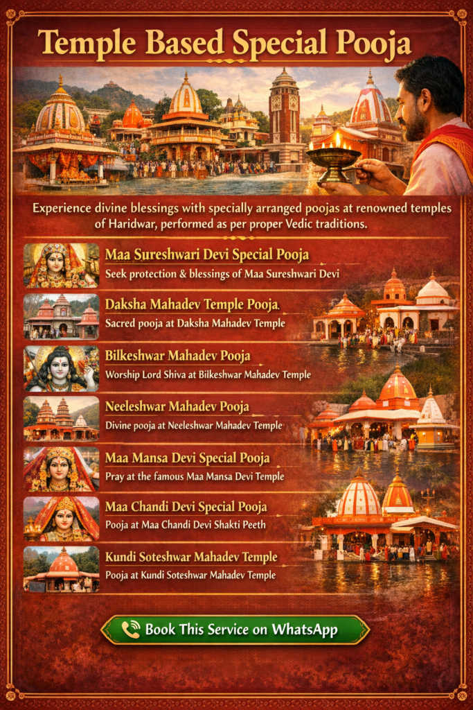 Experience divine blessings with specially arranged poojas at renowned temples of Haridwar, performed as per proper Vedic traditions.