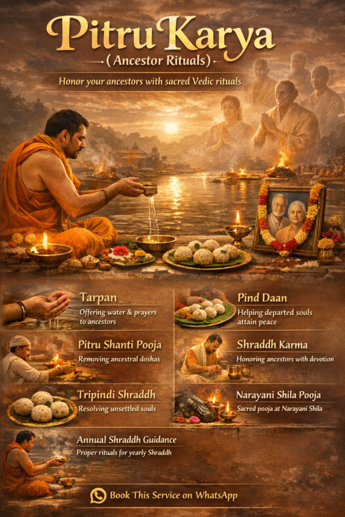 Perform sacred Pitru Karya rituals with proper Vedic vidhi to honor ancestors and seek peace, blessings, and spiritual balance.