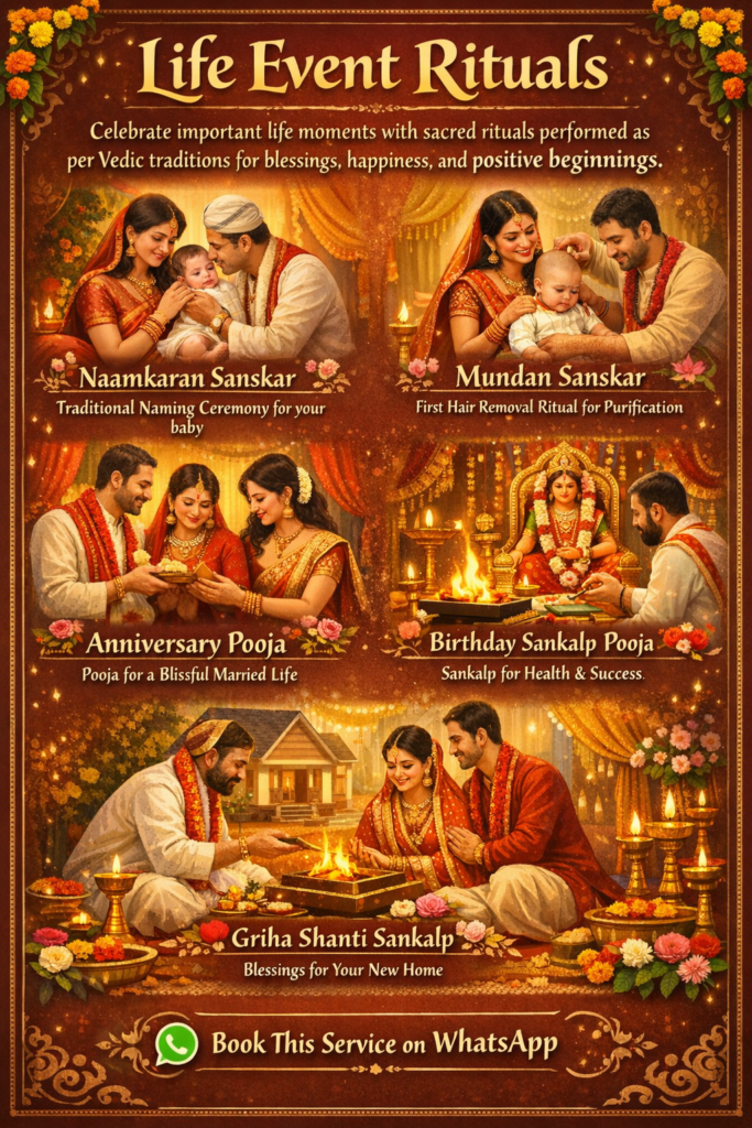 Celebrate important life moments with sacred rituals performed as per Vedic traditions for blessings, happiness, and positive beginnings.